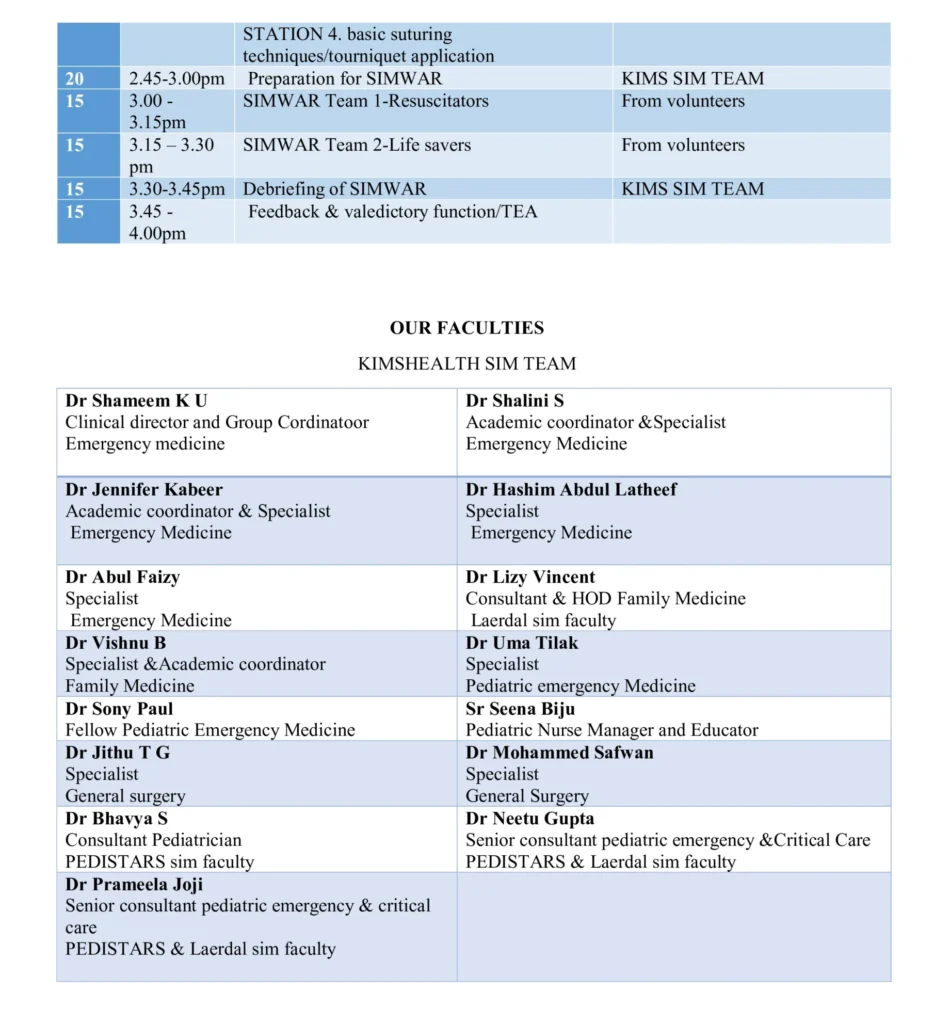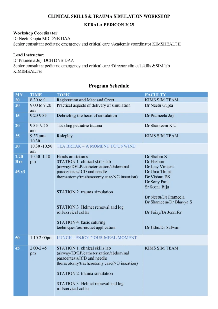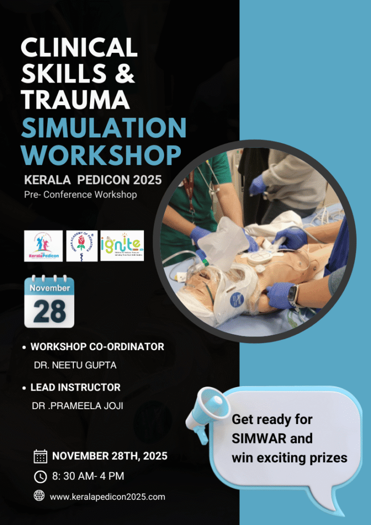 This pre-conference event of Kerala Pedicon 2025 combines simulation-based learning, interactive case discussions, roleplay, and team competitions (SIMWAR) to provide practical exposure for pediatricians and emergency medicine professionals.